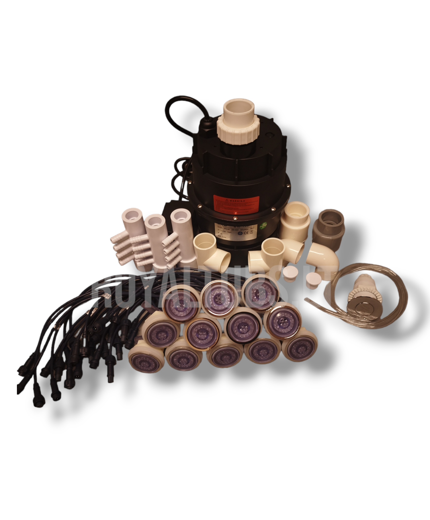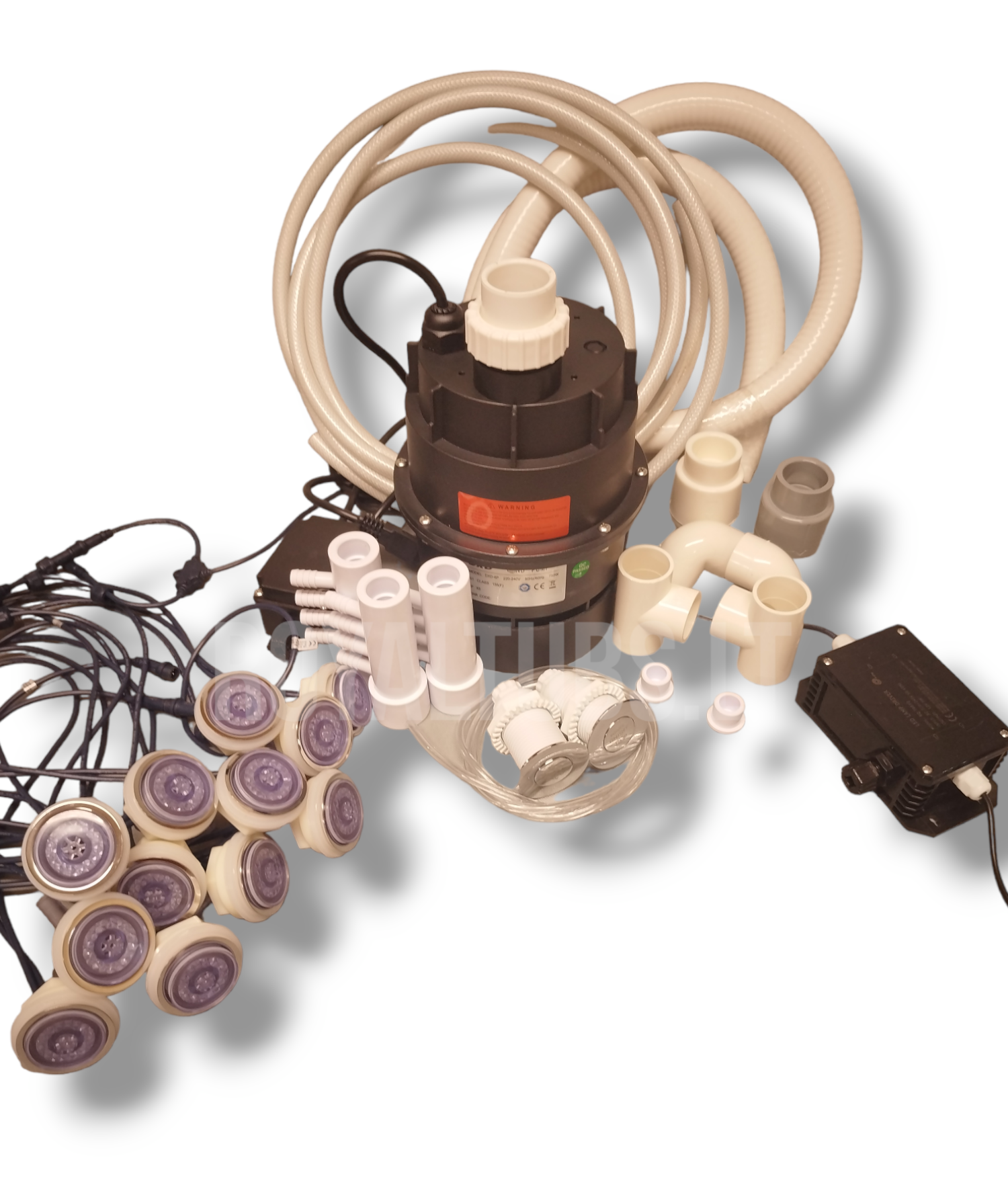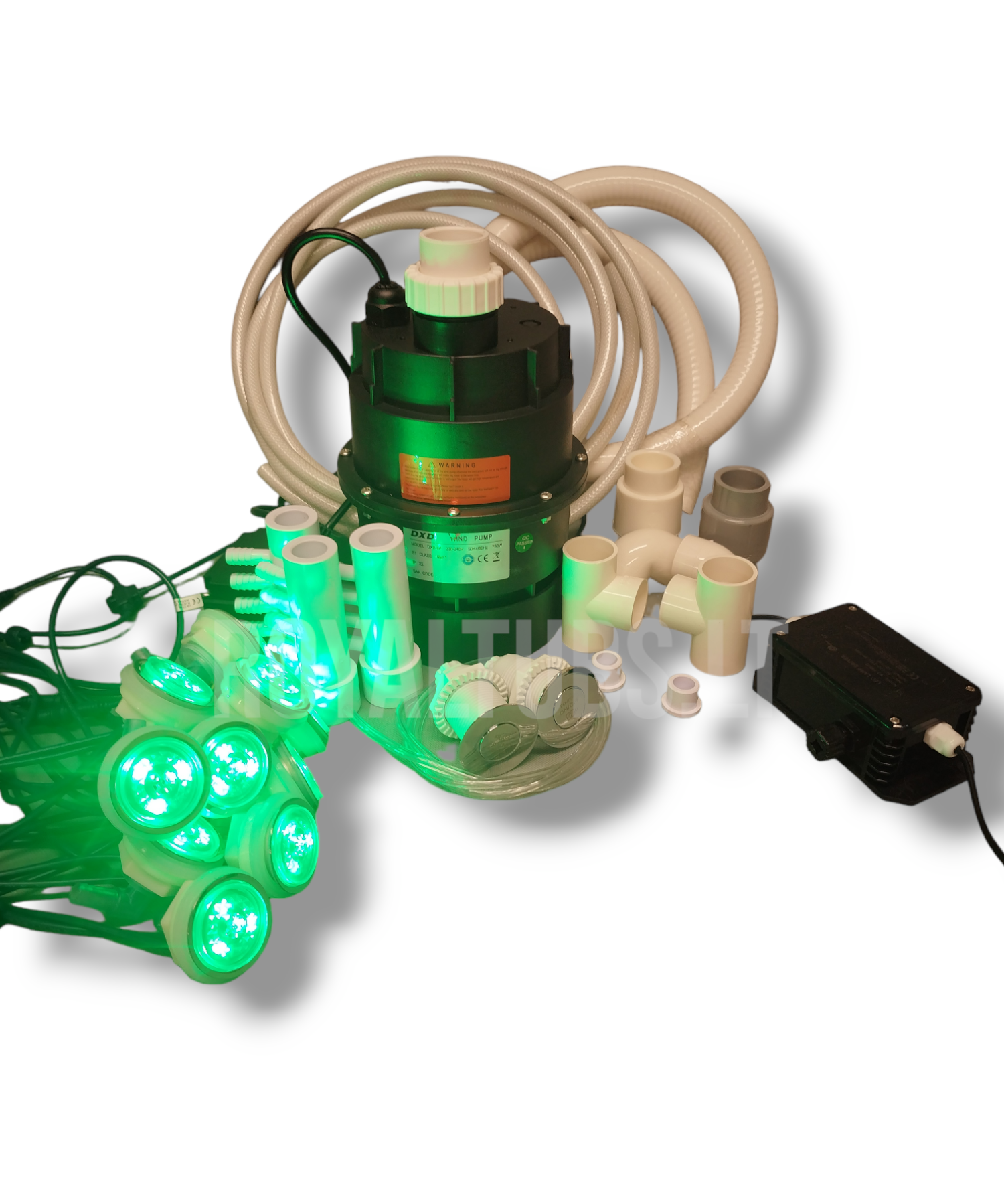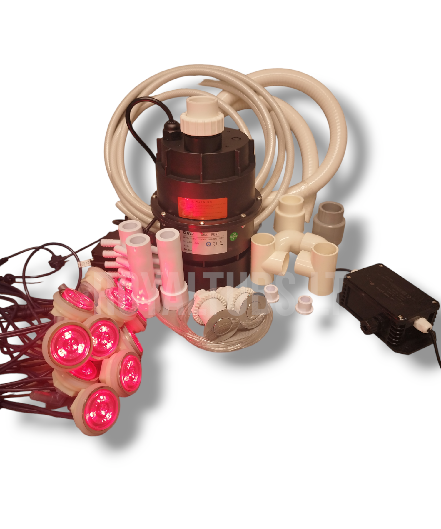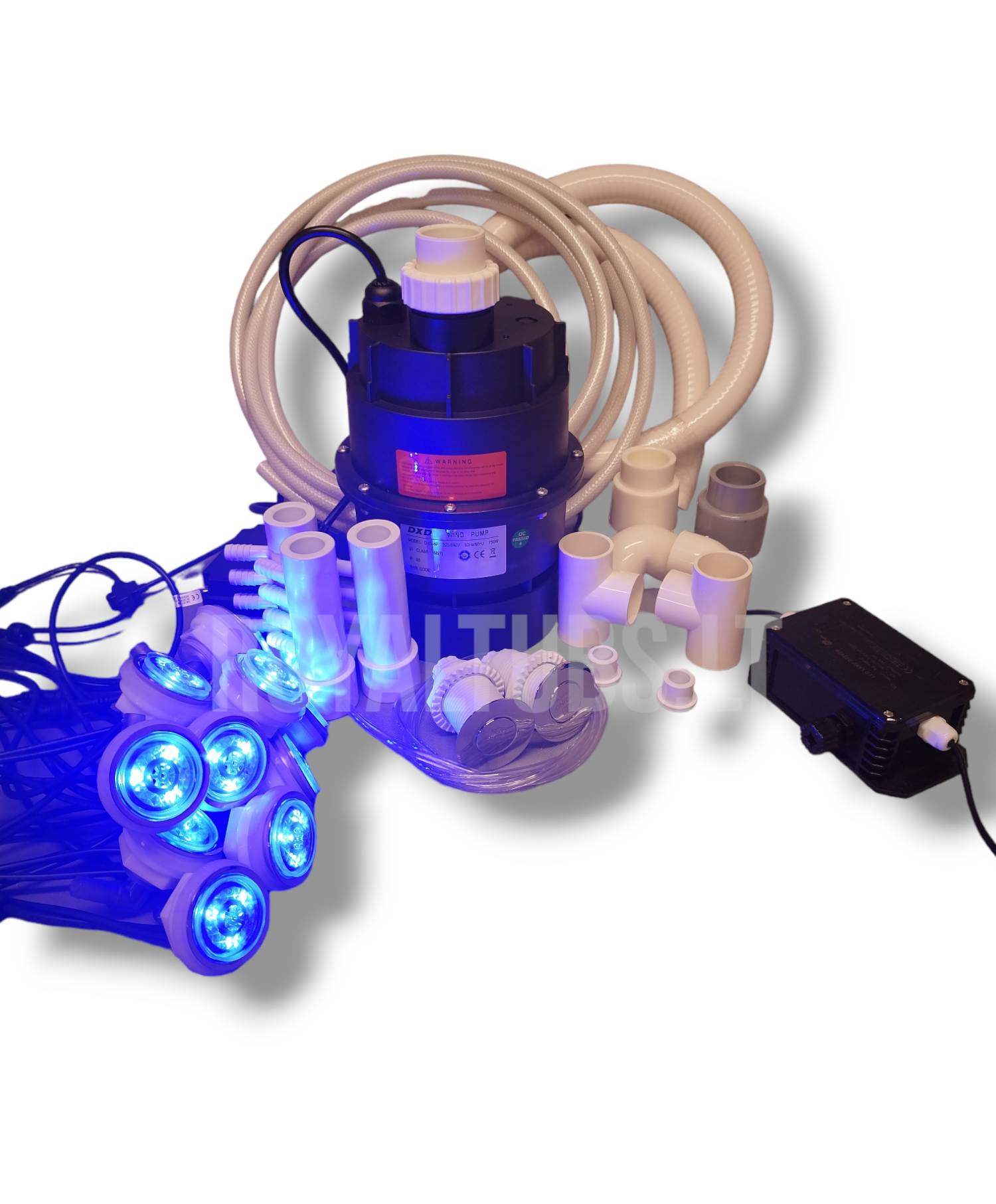 Oro masažo sistema. Komplekte visi reikalingi plastikai, drenažo ir atbulinis vožtuvai, žarnos, jungiklis, LED valdiklis, siurblys, LED purkštukai.